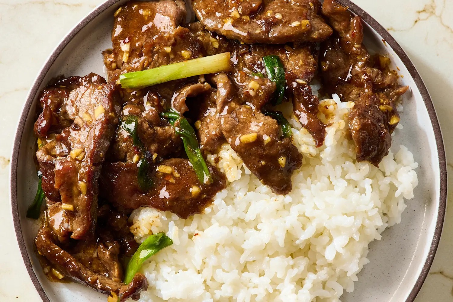 Убавьте огонь до среднего. Добавьте в сковороду зеленый лук и обжаривайте 30 секунд. Влейте соус, постоянно помешивая и соскребая лопаткой со дна сковороды все ароматные прижарки. Как только соус загустеет и станет глянцевым (примерно через 1–1,5 минуты), верните в сковороду мясо вместе со всеми выделившимися соками. Перемешайте, чтобы соус покрыл каждый кусочек, и подавайте немедленно на подушке из теплого риса.